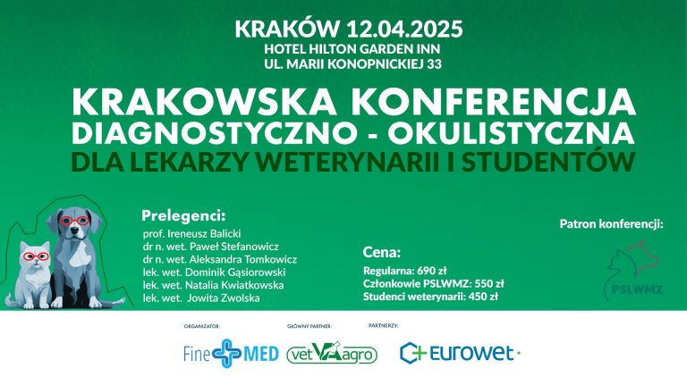 Zapraszamy na drugą edycję Krakowskiej Konferencji Okulistyczno – Diagnostycznej dla lekarzy weterynarii i studentów! Odbędzie się 12 kwietnia 2025r. w hotelu Hilton Garden Inn w
