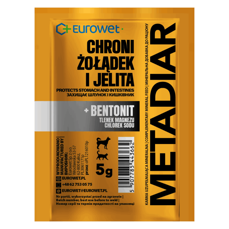 ? METADIAR – naturalna ochrona żołądka i jelit ? Chroni. Łagodzi. Stabilizuje trawienie. ? Osłania przewód pokarmowyBentonit tworzy ochronną powłokę na błonie śluzowej żołądka i