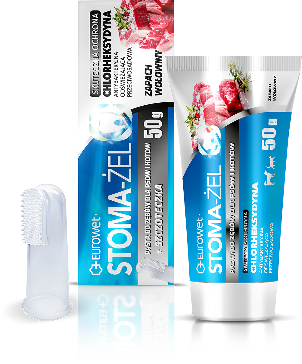 Stoma-gel toothpaste for dogs and cats with beef scent. The added fragrance makes the animals readily accept the application of the paste. Chlorhexidine contained in the paste has an inhibitory effect on the development of undesirable microflora in the oral cavity, removes unpleasant odor and maintains hygiene of teeth and gums. Chlorhexidine supports the treatment of inflammation of the gums. Inhibits plaque buildup. protects against bacteria for 8-12 hours. Cleaning agents prevent tartar buildup and produce an emulsion that, with food particles, helps remove debris from the surface of teeth and gums.