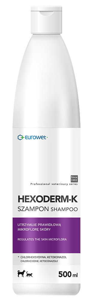 HEXODERM-K is a veterinary dermocosmetic which regulates microflora of the skin by stabilising pH and prevents drying by the formation of a protective fat-protein layer. Chlorhexidine and ketoconazole kill harmful microorganisms that cause skin conditions. Addition of gentle washing substances allow for frequent use.