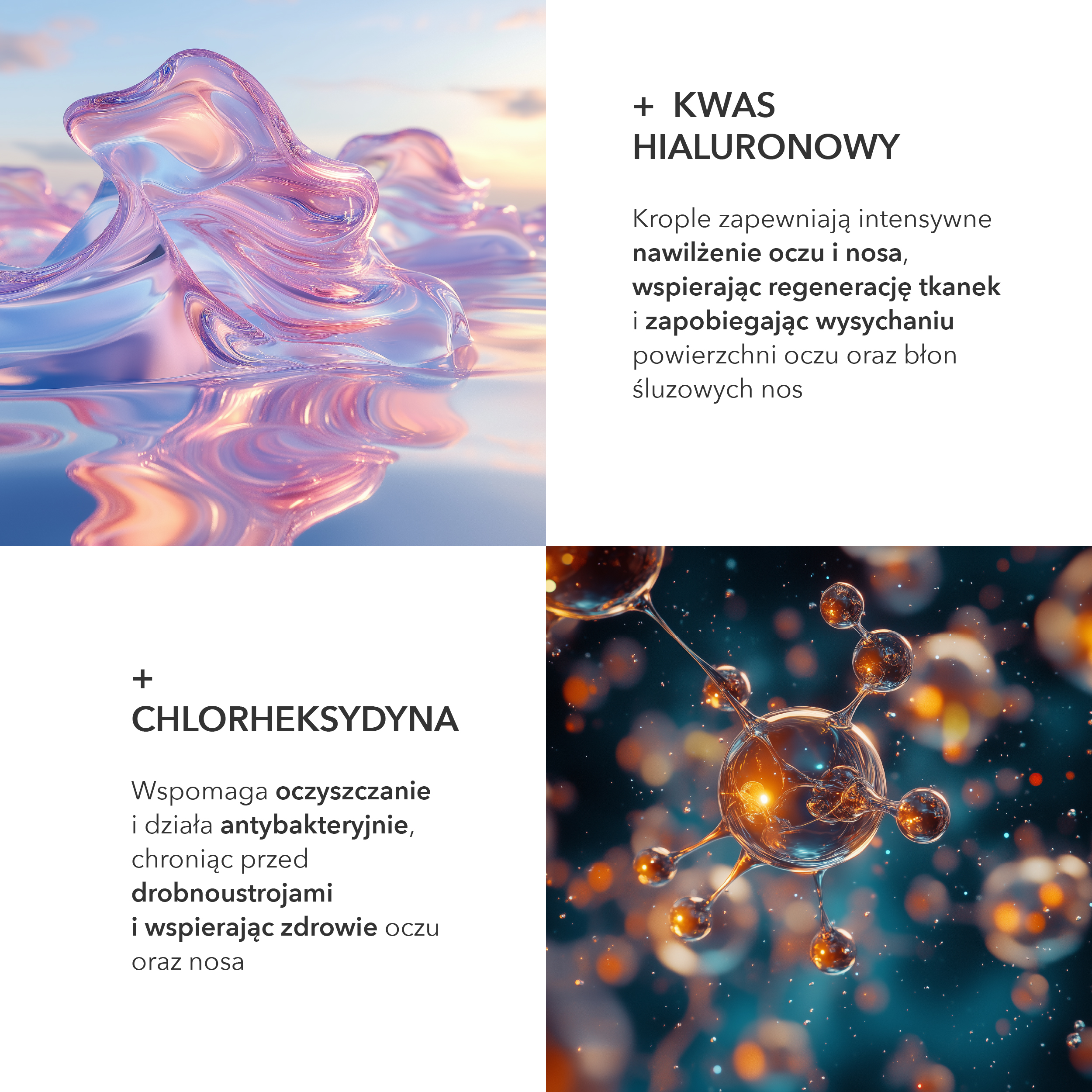 Intensywne nawilżenie i regeneracja dzięki kwasowi hialuronowemu – idealny dla wrażliwych oczu i nosa. Krople łagodzą podrażnienia, wspierają nawilżenie i pomagają w usuwaniu zanieczyszczeń!